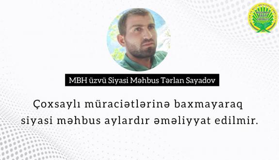 Onurğasının aşağı hissəsində yaranan şiş səbəbindən ciddi problemlərlə üzləşən siyasi məhbus çoxsaylı müraciətlərinə baxmayaraq əməliyyata alınmır. Bunu Umbakı ciddi qapalı rejimli müəssisədə cəza çəkən Tərlan Sayadovun özü bildirib.